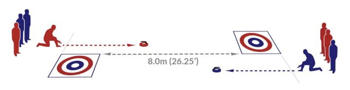 To begin floor curling, find a smooth, flat surface such as our synthetic rink. Place your two target mats with the house (the rings) approximately 8 meters (26.25 feet) apart. Each mat should be slightly offset to avoid standing on the mats when delivering the stones.